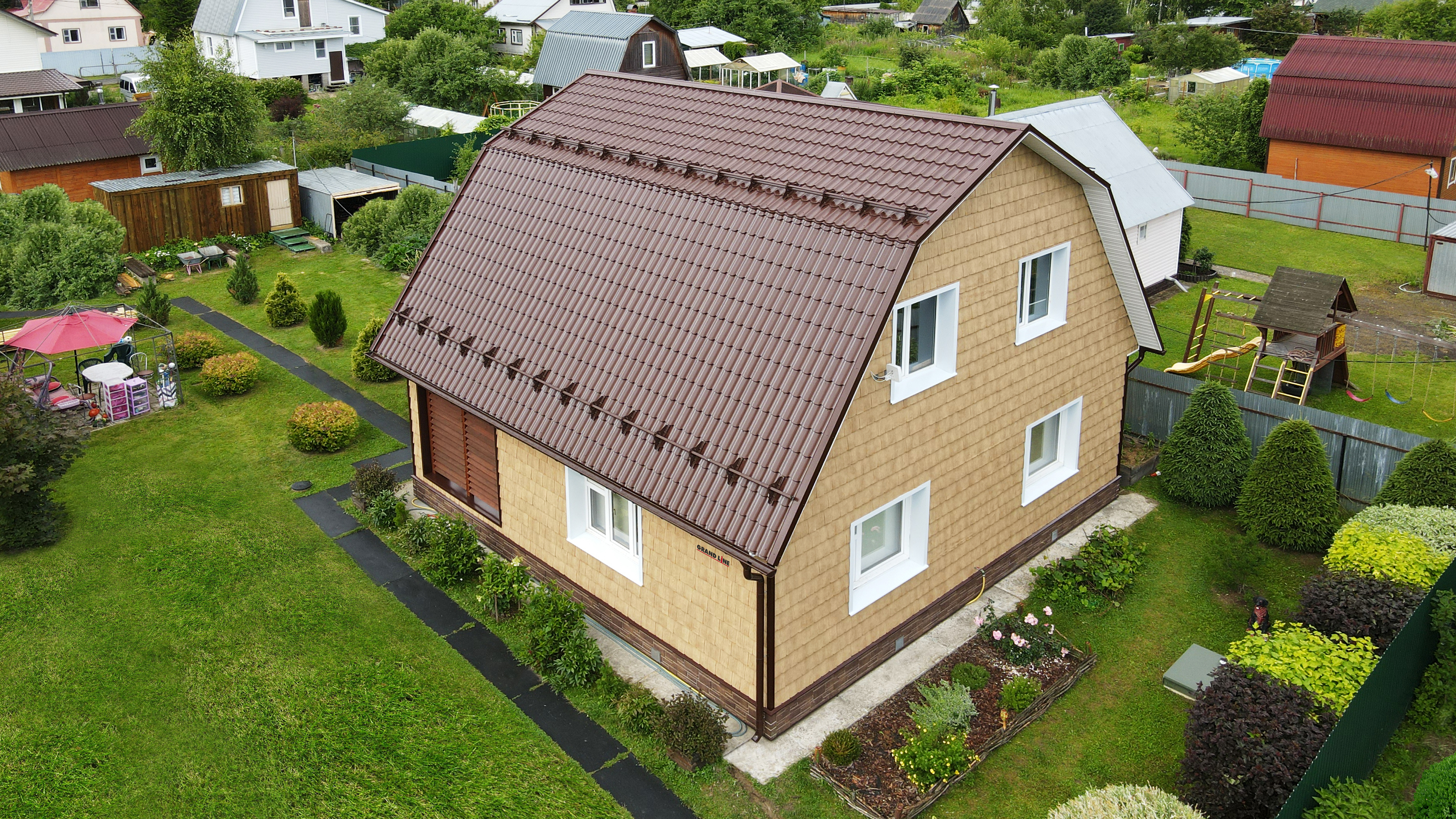 - Широкий ассортимент металлочерепицы Grand line, более 28 оттенков RAL и 13 типов покрытия;